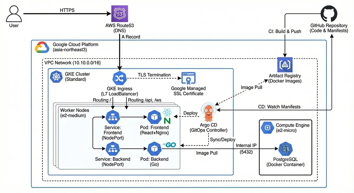 | 네트워크(외부) | GKE Ingress (L7 LoadBalancer) | Nginx Container (Reverse Proxy) |