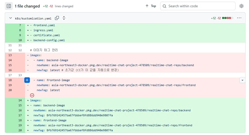 kustomize edit set image명령어를 사용하여kustomization.yaml의 태그 정보를 업데이트한다. - Commit & Push: 변경된 Manifest 파일을 Git 저장소에 다시 커밋하고 푸시한다.