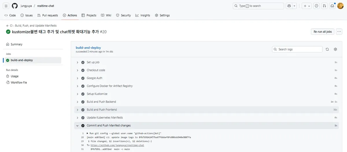 GitHub Actions가 이미지 빌드 후, kustomization.yaml 파일을 수정하여 자동으로 커밋을 생성하는 것을 확인했다.