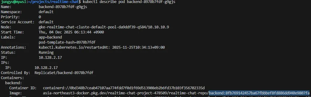 마지막으로 GKE 클러스터 내부에서 실행 중인 파드의 정보를 조회하여, 실제 컨테이너가 해당 버전의 이미지를 사용하고 있는지 검증했다.