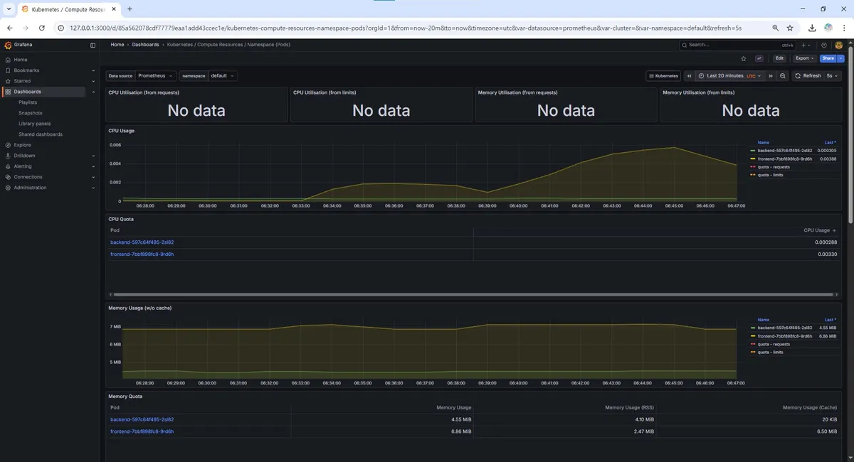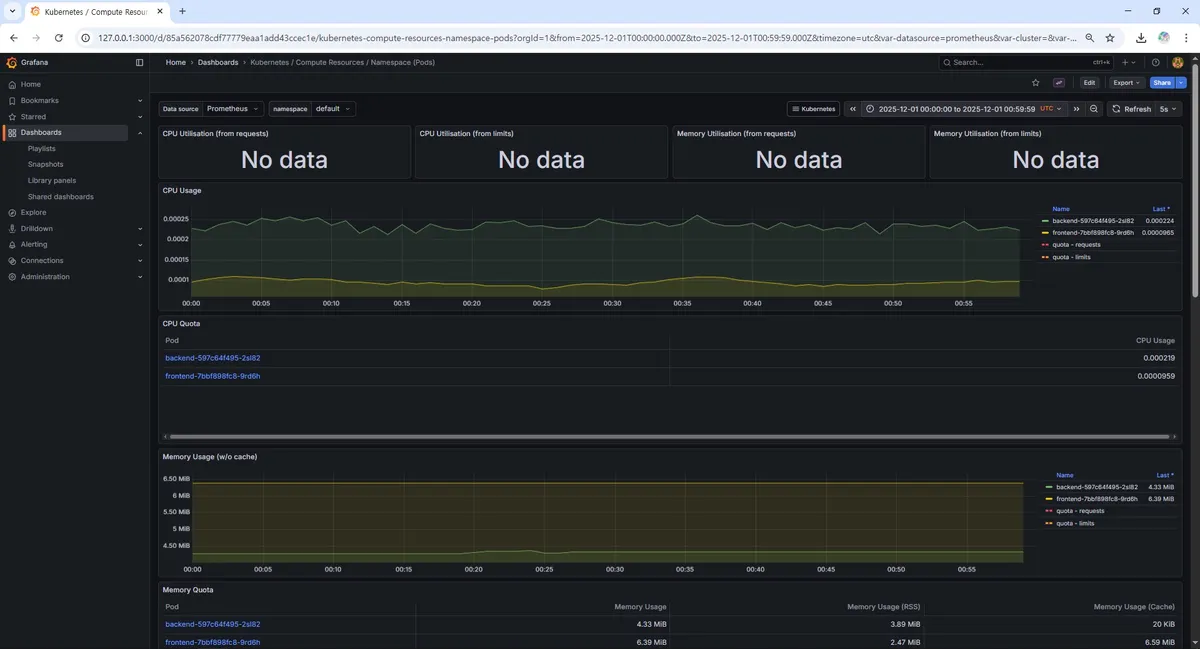 kube-prometheus-stack은 설치 시점에 이미 쿠버네티스 운영에 필요한 핵심 대시보드들을 함께 프로비저닝해준다. 그중 Kubernetes / Compute Resources / Namespace (Pods) 대시보드를 통해 우리 애플리케이션(backend, frontend)이 배포된 default 네임스페이스의 리소스 사용량을 중점적으로 관측하기로 했다.