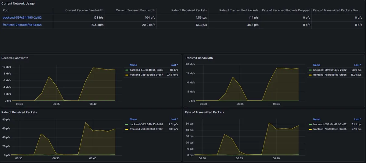 부하 테스트 시작과 동시에 backend 파드의 CPU 사용량이 급격하게 치솟는 것을 확인할 수 있었다. 평소 유휴 상태에서는 거의 0에 가까웠던 사용량이 요청 처리를 위해 리소스를 점유하며 그래프가 우상향하는 모습이 뚜렷하게 나타났다.