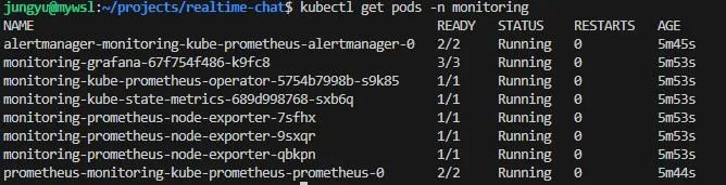 설치 후 kubectl get pods -n monitoring 명령어를 통해 수집기(Prometheus), 시각화 도구(Grafana), 그리고 노드 상태를 체크하는 에이전트(Node Exporter)들이 정상적으로 실행 중임을 확인했다.