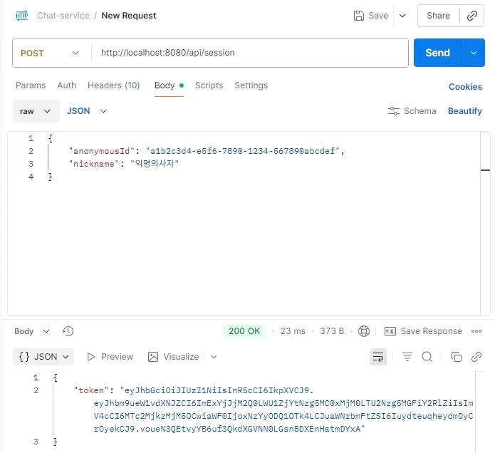 POST /api/session엔드포인트를 구현하여, 클라이언트가 전송한anonymousId(브라우저 고유 식별자)와nickname정보를 페이로드(payload)로 담는JWT(JSON Web Token)를 발급하도록 했다.