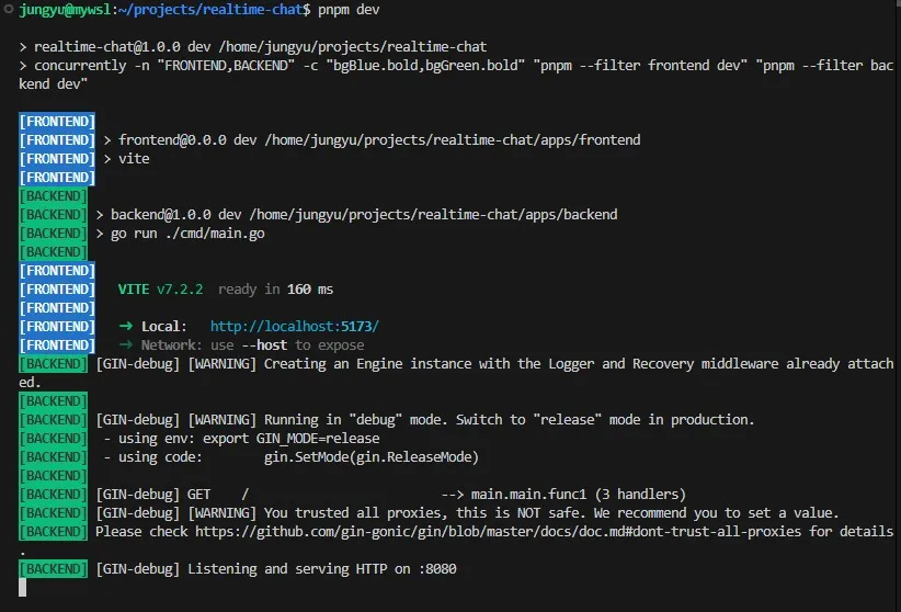 concurrently라이브러리를 도입했다. 루트package.json에pnpm dev스크립트를 정의하여, 단일 명령어로 Vite 개발 서버와 Go 애플리케이션을 동시에 실행할 수 있도록 구성했다. 각 프로세스의 로그는 터미널에서 이름과 색상으로 명확히 구분되도록 설정하여 가독성을 높였다.